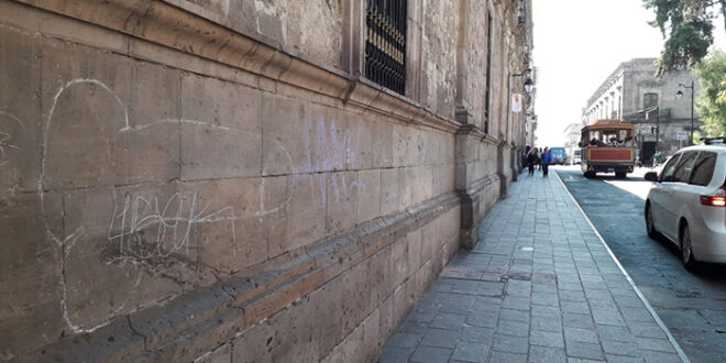 Redacción/La Voz de Michoacán Morelia, Michoacán. En el marco de la celebración de Día de Muertos en la ciudad de Morelia, el Colegio Primitivo y Nacional de San Nicolás de Hidalgo se encuentra de la siguiente forma: Foto: Héctor Jiménez. Los actos de vandalismo en el centro histórico y en distintos edificios del mismo no se detienen. Cabe recordar que el pasado los costos por retirar un graffiti en la cantera del centro Histórico de Morelia, ascienden a los 500 pesos por metro cuadrado. El componente conocido como “Micrograss” es de consistencia polvosa, y su utilización en los edificios de carácter histórico ha sido aprobada por restauradores del Instituto Nacional de Antropología e Historia como un mecanismo para rehabilitar los muros de los inmuebles.