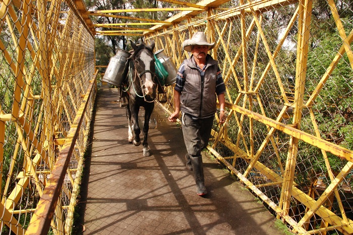 Un caballo y su dueño cruzan tranquilamente un puente peatonal