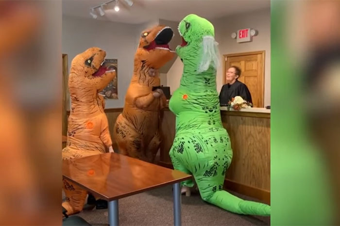 VIDEO | Se casaron a lo Jurásico ante una juez: disfrazados de dinosaurio